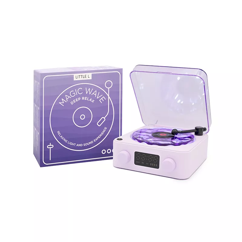 - Altavoz sensorial con forma de tocadiscos, color lila.