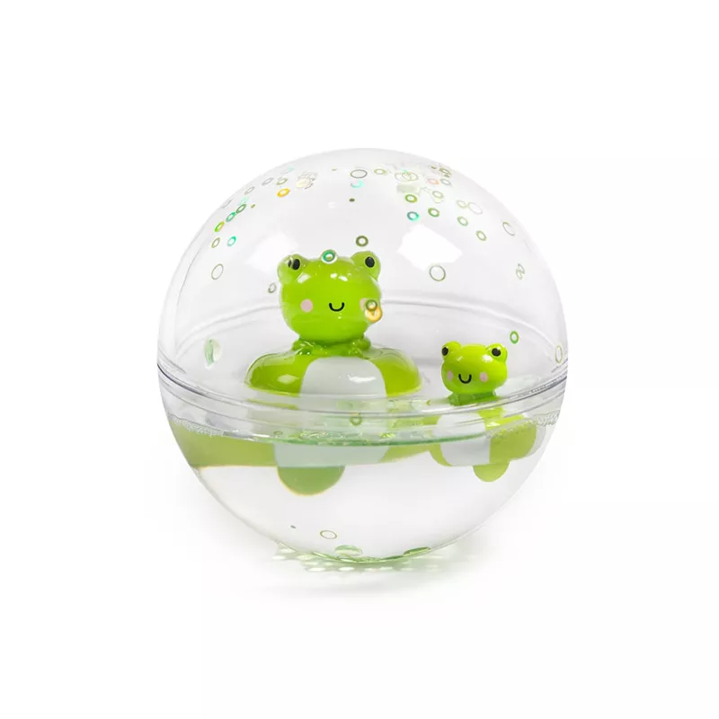 - Bola sensorial con líquido transparente y diferentes objetos flotantes para explorar: dos figuras de ranitas, burbujas brillantes, gotas redondas y pequeñas ranitas verdes.