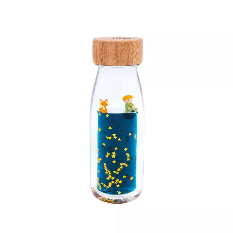 - Botella sensorial con líquido translúcido azul marino y diferentes objetos flotantes para explorar: 2 muñecos (Principito y zorro) y estrellas brillantes doradas.