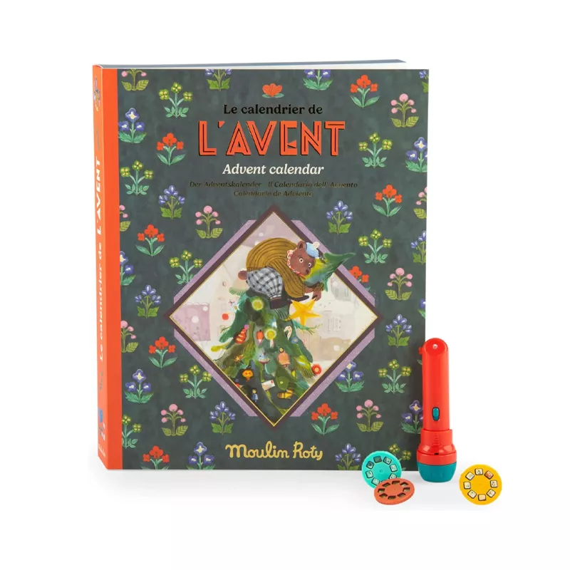 - Calendario de adviento con diferentes ventanas para abrir y descubrir una linterna proyectora de cuentos y 23 discos ilustrados de historias.