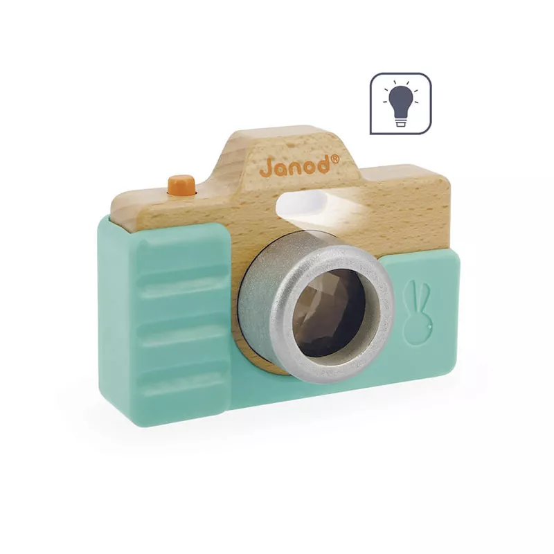 ¡1, 2, 3… Sonríe! Con esta bonita cámara de fotos de madera, los pequeños se divertirán imitando a los mayores. Cuando aprieten el botón, el flash se activará y escucharán el sonido al tomar la fotografía. Además, si miran por la mirilla, descubrirán que es un divertido caleidoscopio con el que verán formas y colores extraordinarios. Una cámara llena de sorpresas, con funda de silicona incluida.De 18 a 36 meses