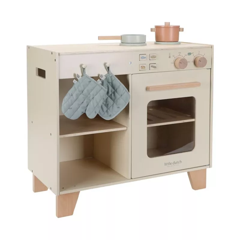 ¡Atención, pequeños chefs! Esta preciosa cocina de madera es perfecta para preparar las comidas más deliciosas. Ya sea horneando un pastel en el horno o cocinando una sabrosa sopa en los fogones, los pequeños se lo pasarán en grande. El set incluye dos sartenes, una manopla y un paño, y está equipado con botones ilustrados para mayor realismo. Además, podrás combinar la cocina con la nevera o el set de lavadora a juego para crear un set de cocina al completo. ¿Qué hay en el menú de hoy?A partir de 3 años