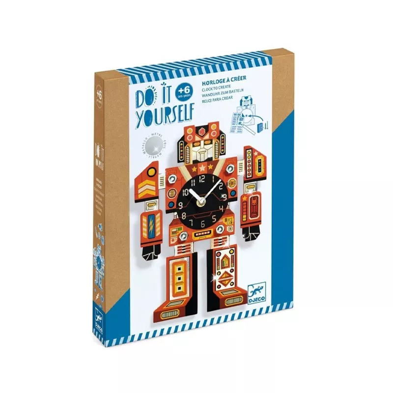 Un kit creativo para crear un divertido reloj para decorar y montar con más de 100 calcomanías y accesorios. Solo necesitaréis el lápiz para frotar las calcomanías y transferirlas a las diferentes partes del robot que formarán la estructura del reloj. A continuación, podréis unir las piezas con los pernos y tuercas que incluye. Y ya sólo quedará montar el mecanismo ¡para que os de la hora!A partir de 6 años