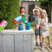 ¿Quién tirará más latas al suelo de un solo lanzamiento? Un divertido juego de puntería, ideal para jugar al aire libre junto a la familia o para organizar divertidas competiciones en celebraciones y fiestas de cumpleaños. Con 3 saquitos de lanzamiento y 6 divertidas latas ilustradas con animales por un lado y numeradas del 1 al 6 por el otro.A partir de 3 años