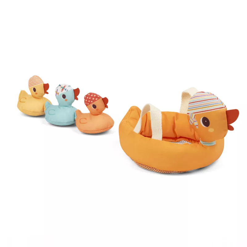 - Mamá pato también flota en el agua y acoge a sus pequeños en su lomo de una red. Equipada con asas, ¡es muy fácil de transportar dentro y fuera del baño!