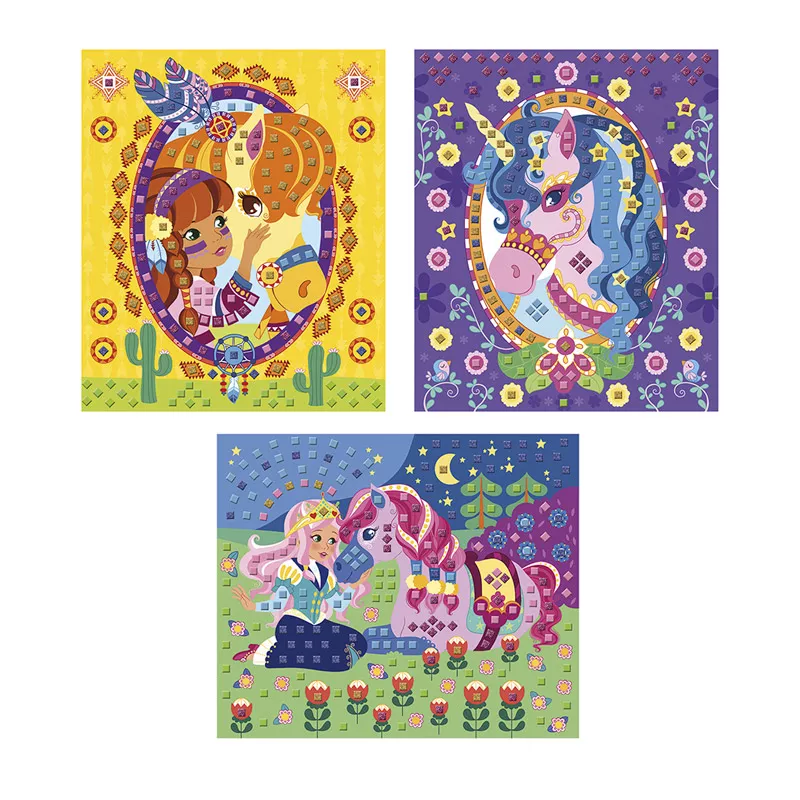 Diviértete decorando estas bonitas láminas con mosaicos de foam. Podrás darle color y brillo a las 3 ilustraciones de preciosos ponis y unicornios. Solo tendrás que despegar las teselas de colores adhesivas, pegarlas en su lugar correspondiente ¡y listo!A partir de 5 años