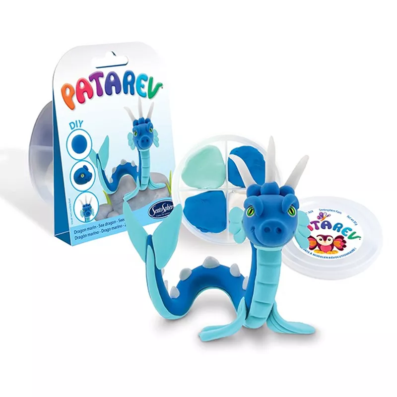 ¿Quieres aprender a crear un dragón con Patarev? Dentro de esta pequeña caja encontrarás todo lo necesario para crearlo: pasta de colores Patarev, unos ojos saltones y las instrucciones paso a paso. Patarev es una plastilina revolucionaria: se seca al aire (sin agrietarse), por lo que podrás conservar tus bonitas creaciones. Además, ¡no se pega ni mancha! Puedes hacerla rebotar, añadirle fragancias y mezclar los colores para crear nuevos tonos. Después, podrán jugar con sus creaciones a su antojo. Su textura ligera y elástica es muy agradable de trabajar y animará a todos los artistas, independientemente de su edad, en su proceso creativo.A partir de 5 años