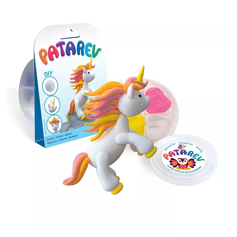 ¿Quieres aprender a crear un unicornio con Patarev? Dentro de esta pequeña caja encontrarás todo lo necesario para crearlo: pasta de colores Patarev, unos ojos saltones y las instrucciones paso a paso. Patarev es una plastilina revolucionaria: se seca al aire (sin agrietarse), por lo que podrás conservar tus bonitas creaciones. Además, ¡no se pega ni mancha! Puedes hacerla rebotar, añadirle fragancias y mezclar los colores para crear nuevos tonos. Después, podrán jugar con sus creaciones a su antojo. Su textura ligera y elástica es muy agradable de trabajar y animará a todos los artistas, independientemente de su edad, en su proceso creativo.A partir de 5 años