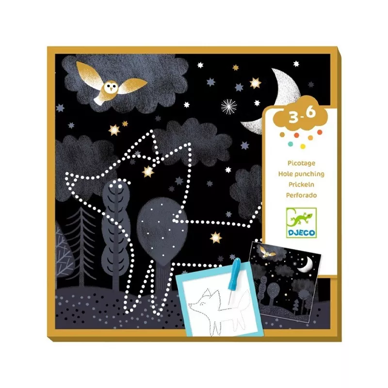 - Contiene 16 laminas ilustradas con un fondo nocturno, 16 hojas de animales por puntos, una espuma con marco, un punzón e instrucciones paso a paso.