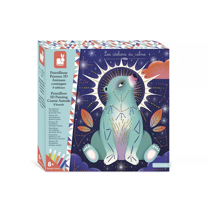 ¡Pasa un rato entretenido gracias a la técnica del puntillismo! Este bonitos estuche creativo sirve para decorar 8 cuadros con temática de animales cósmicos con la pintura en 3D que incluye (dorada, amarilla, naranja, rosa y azul). El puntillismo consiste en aplicar pintura en forma de puntos: al secarse, esa pintura adquiere relieve y da un increíble efecto 3D. Quedarán unos cuadros perfectos para colgar y decorar cualquier rincón de su habitación.A partir de 8 años