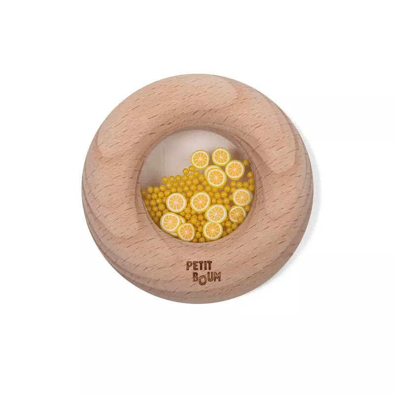 - Sonajero sensorial con forma de donut y ventana transparente con bolitas y figuritas de limones en su interior.