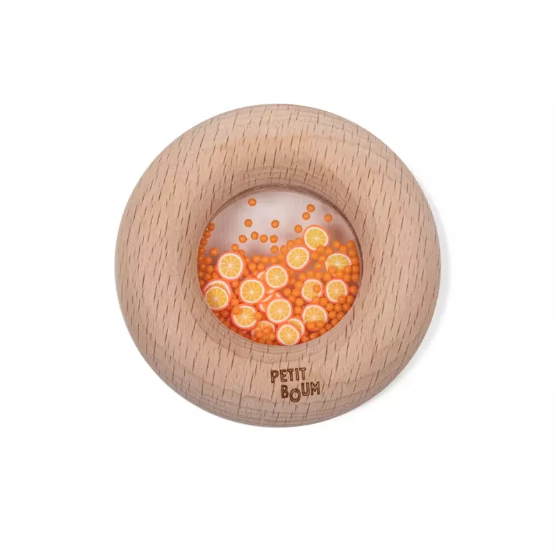 - Sonajero sensorial con forma de donut y ventana transparente con bolitas y figuritas de naranjas en su interior.
